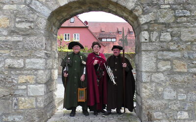 Gerne nehmen wir Gäste auf unseren Streifzügen durch die Gässli mit. Auf die geschichtsträchtigen Punkte werden wir durch das Horn des Eibelstadter Nachtwächters hingewiesen. Der Sommerhäuser Nachtwächter wird dann mit Moritaten und Gedichten uns in die Geheimnisse des Ortes einweihen. Und ich, Chlodhild? Ich erzähle von der Ortsgeschichte und meinen Abenteuern. Leider habe ich manchmal meine fränkische Gosche nicht unter Kontrolle und red de anere dazwische.